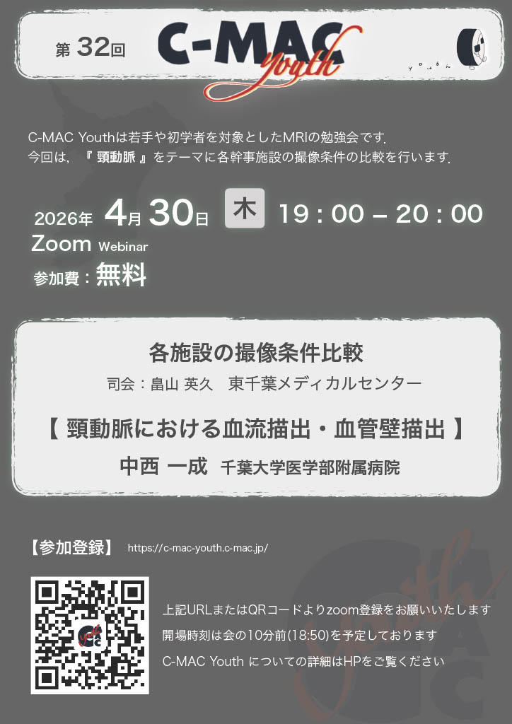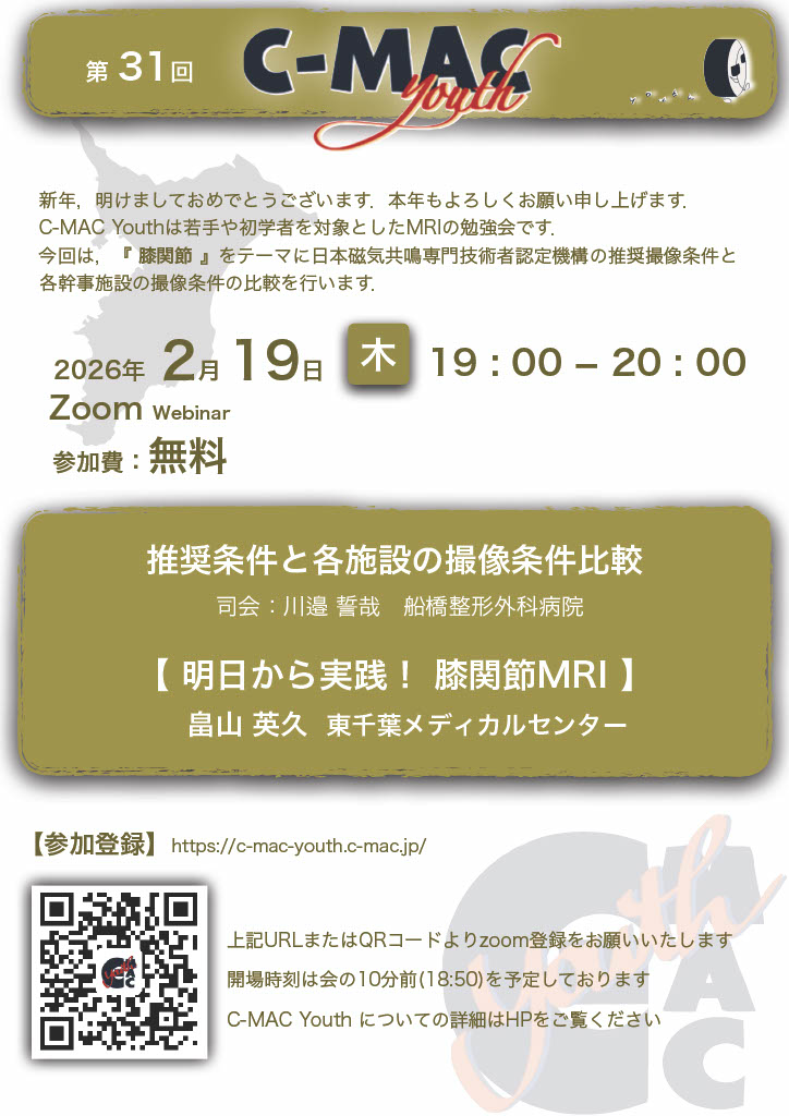 「教科書をイチから読むのは大変…」 「基礎的なことは質問しにくい…」 「オンラインでは長時間集中できない…」 私たちと一緒にM R I の基礎を勉強しませんか ?? 若手による、若手のためのMRI勉強会 c-mAC YOUTH 誕生 !! 若手技師による新企画、始動します 勉強会内容 CONTENTS 各プロトコルについて深掘りします日本磁気共鳴認定機構が提示する各部位推奨プロトコルと幹事施設の実際を比較しながら日々のシーケンスについて一緒に深掘りしていきましょう 開催予定テーマ 5 月C-MAC合同7 月前立腺9 月肩関節12月女性骨盤2月膝関節4月頸動脈6月下垂体8月足関節・・・・・・ 次回 2月19日(木) 19:00~ いつもご参加ありがとうございます今月もお気軽にご参加お待ちしております 登録 お問い合わせ QUESTION AND ANSWER Q and A 質問募集中です! 勉強会について ABOUT US 当勉強会はC-MAC の創設理念を受け継ぐ勉強会です。若手のアイデアを尊重した新しいスタイルのMRI勉強会となることを目指しています。 C-MAC 幹事 MEMBERS 樺島徹 東京都立墨東病院 山岸嘉希 千葉大学医学部附属病院 土屋洋貴 量子科学技術研究開発機構 QST病院 島田直和 千葉市立青葉病院 中西一成 千葉大学医学部附属病院 酒井亮介 東邦大学医療センター佐倉病院 片岡義貴 聖隷佐倉市民病院 新田圭介 千葉大学医学部附属病院 白倉知明 亀田総合病院 柳秀輝 東京都立駒込病院 佐藤優希菜 千葉大学医学部附属病院 畠山英久 東千葉メディカルセンター 真野力礼 国立がん研究センター東病院 橋爪寧々 国立がん研究センター東病院 川邉誓哉 船橋整形外科病院
